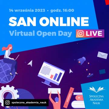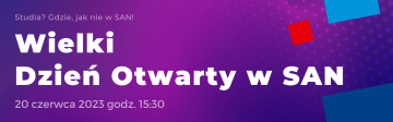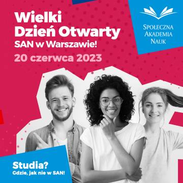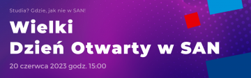 Szukasz odpowiedniego kierunku studiów? 20 czerwca zapraszamy na Wielki Dzień Otwarty w SAN! Poznaj naszą ofertę, weź udział w warsztatach. Widzimy się w SAN! Sprawdź szczegóły!