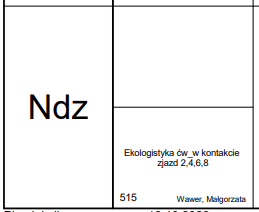 W kratkach, w których podane są przedmioty znajduje się również numer sali, w której odbywają się zajęcia oraz nazwisko prowadzącego. Daty lub numery zjazdów, które podane są przy nazwie przedmiotu oznaczają, że w tych terminach będą odbywać się dane zajęcia.